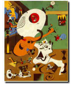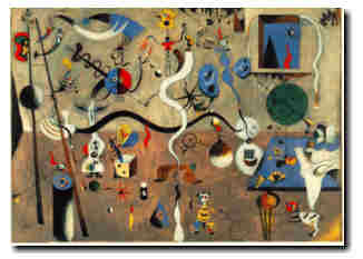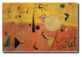 Miro studied in his native Barcelona, and the paintings in his first one-man show in 1918 reflected his interest in Catalan rural life. In 1919 he visited Paris and was for a while influenced by his friend Picasso's Cubism. However, when he settled in Pari's in the early 1920s, he shifted to the Surrealist group. Miros imagination was released by his exposure to the Surrealist idea of a creative unconscious, and for the rest of his life he strived to remain true to an intuitive or unconscious impulse. His fantasy led him to combine both abstract and figurative signs in paintings, sculptures, prints, and drawings throughout his career. Like other twentieth-century masters, Miro explored many media and worked on large commissions, including murals for Harvard University and two large ceramic walls for the UNESCO building in Paris.