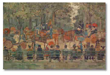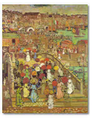 Prendergast studied in France long enough to master a Post-Impressionist, quasi-poz'ntillist technique and returned to America to become one of the most original of the early-twentieth-century modernists. His watercolors in particular sparkle. They are informed by the techniques of the French, but Prendergast took creative libertiesthat gave his small works a monumental character that set them apart from all other American works of the period.